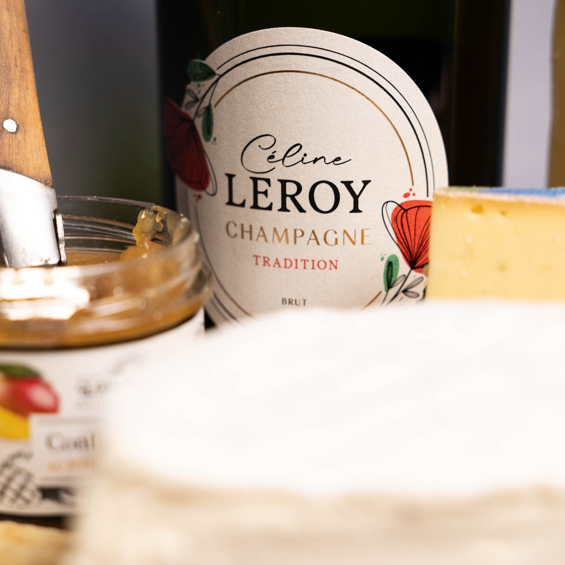 Celebracja to zestaw składający się produktów, tworzących idealne połączenie smaków. Champagne Leroy FM Tradition Brut, klasyczny, wytrawny szampan, doskonale komponuje się z wyrazistymi serami. Le Brillat Savarin z truflami ma kremową konsystencję i bogaty smak. Comté AOP, dojrzewający przez 6 miesięcy, wnosi delikatnie orzechowe nuty. Ser Morbier AOP oferuje subtelny, ziemisty posmak. Konfitura z mango i papryką Espelette dodaje słodko-ostrej nuty, a solone krakersy stanowią chrupiący dodatek do tej kompozycji.